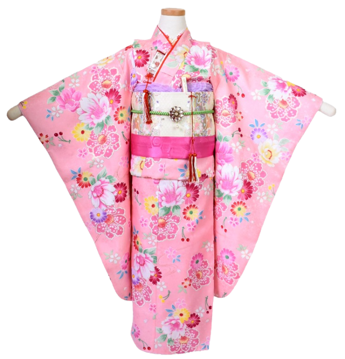S07-13ピンクと黄色染分けに芍薬•秋桜•刺繍入り晴着